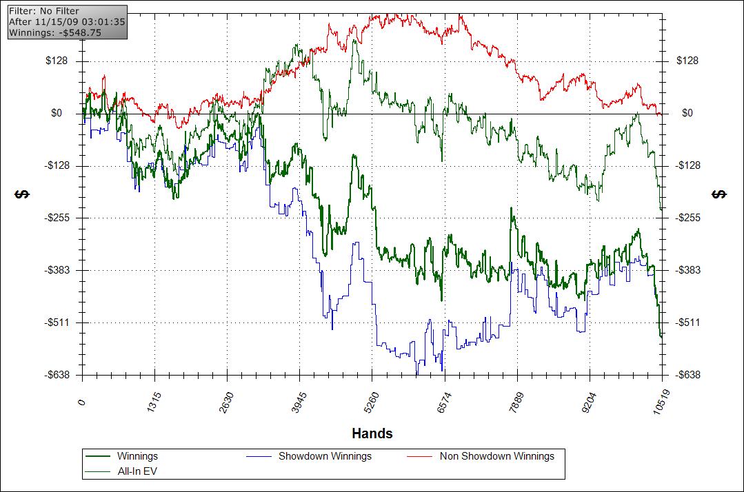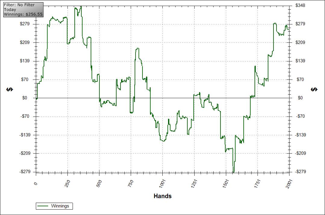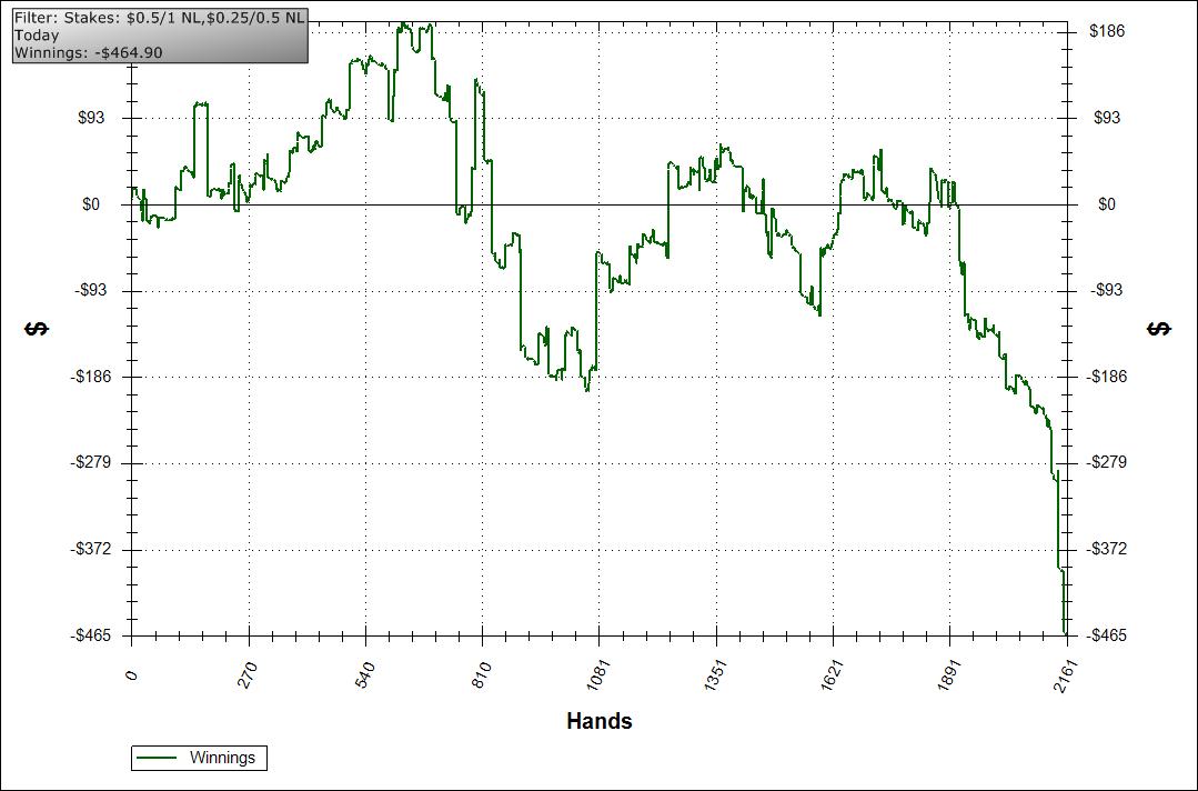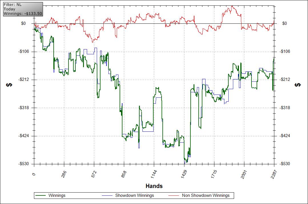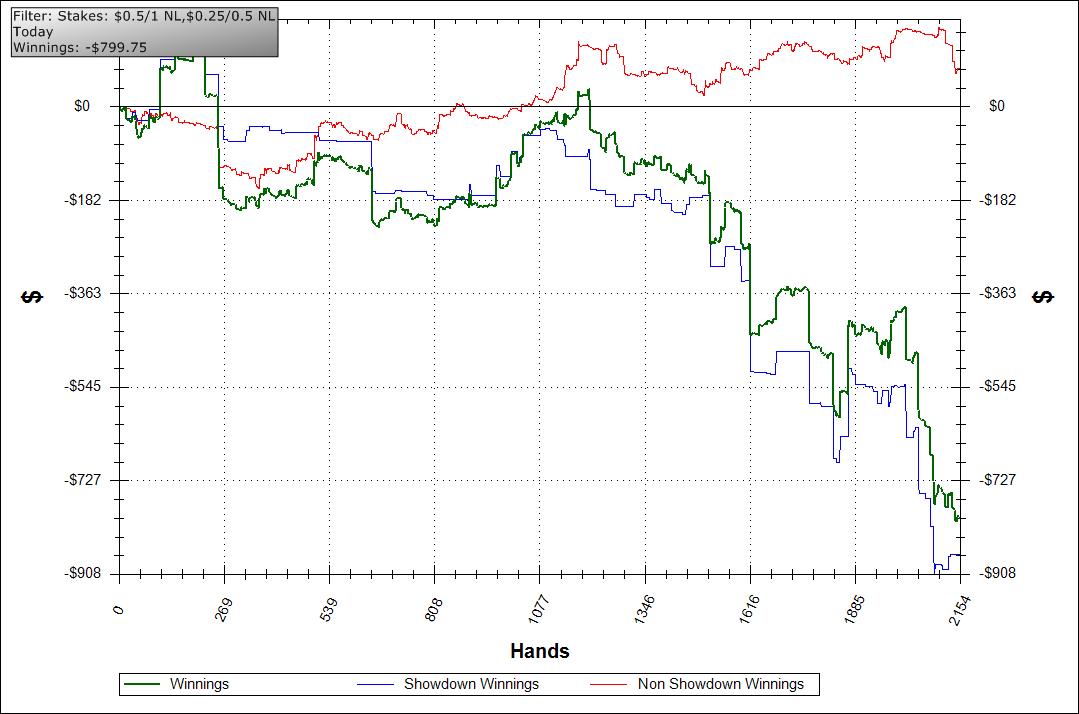 Anything good I had never got paid off and anytime I got to showdown in anything 50bb+ it was an automatic lose. Classic KK into AA, set over set, two pair losing to turned straight, flush over flush, set to flush. Everything, the whole assortment.