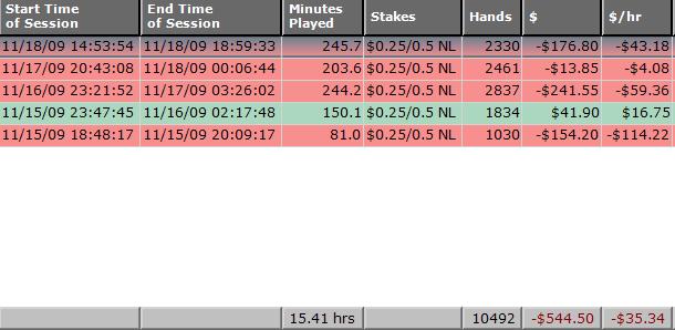 I've played 3 NL100 sessions and I'm doing quite well. I'm only 6 tabling and focusing on getting reads and finding unusual spots to get value from the regulars. So far so good. My first 2 sessions were killer as I completely pwned. Todays session was long, grueling, and full of coolers but I battled back to only lose a little bit.