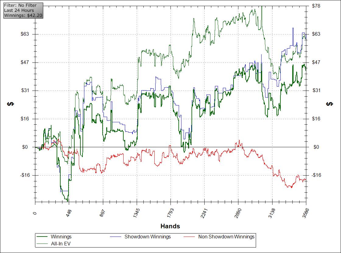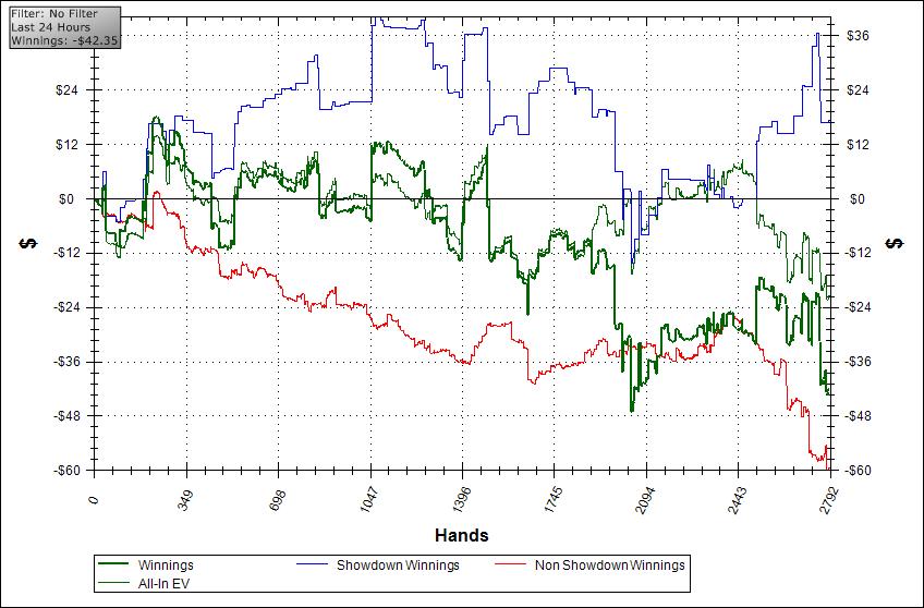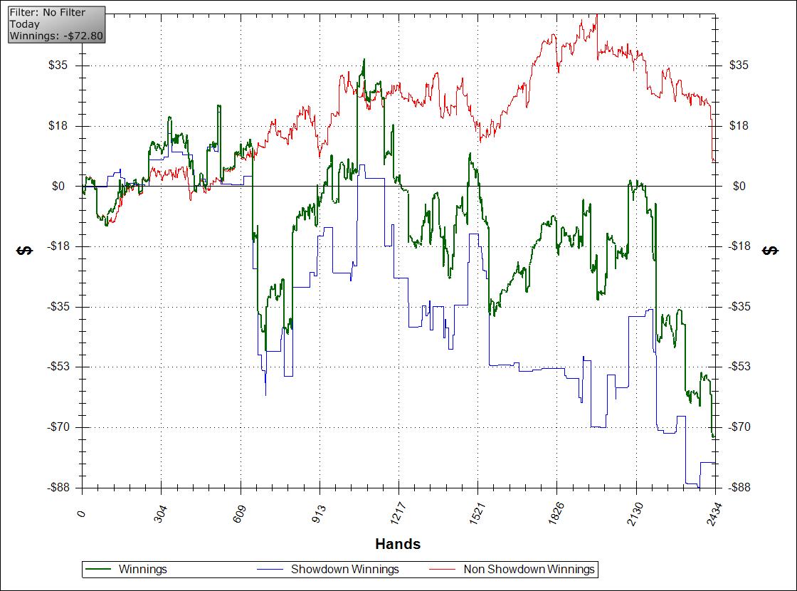 Been trying to focus on my game, creating reads and postflop actions. My showdown winnings are really weird today. 1st half of the day they were seriously abysmal and effecting my winrate(-3BI in 1k hands...), 2nd half of the day they are break even. The big drops in the middle are from when Artanis was fucking around though.. hm.