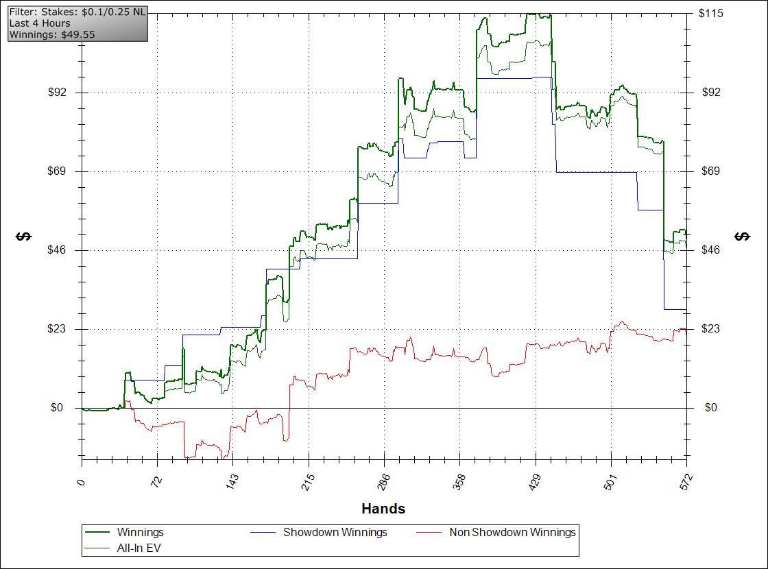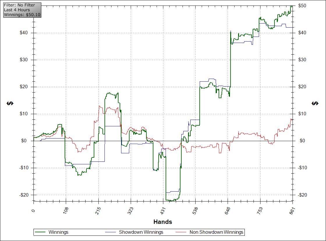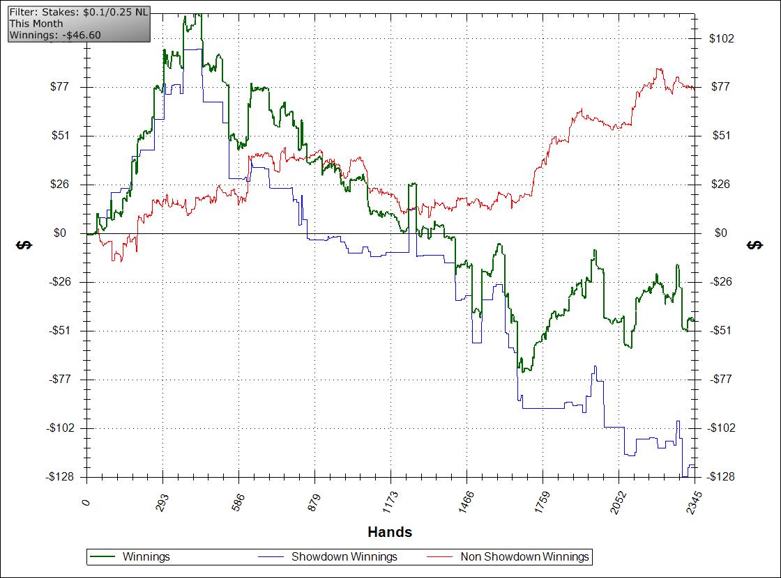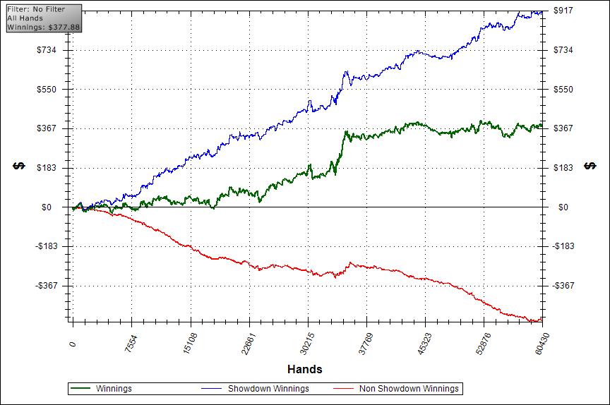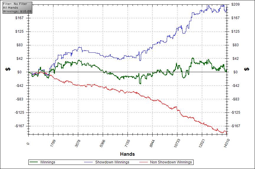 One really interesting note IMO is that my graph goes up only when my nonshowdown was basically break even. My rate of showdown winnings really didn't change overall during those periods.