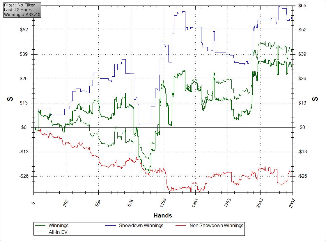 Otherwise, I've played 3 or so sessions at nl25 and I've ran really bad overall IMO. I definitely need to tweak my play, because I seem to be going to showdown too light, but I am straight up running TERRIBLE at showdown. Gonna take a close look at my losing hands for the past 2.4k at nl25.