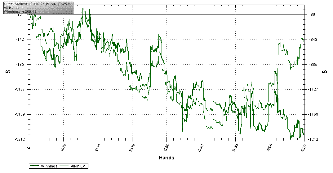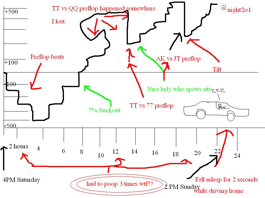 I only managed to swing back up to -$1100. I finally got a stack going at the end of the weekend, and was then card dead for the next 6 or so hours 'til I gave up from exhaustion (and lack of action at 4AM monday morning. I tilted off about $300 which was retarded but D: )