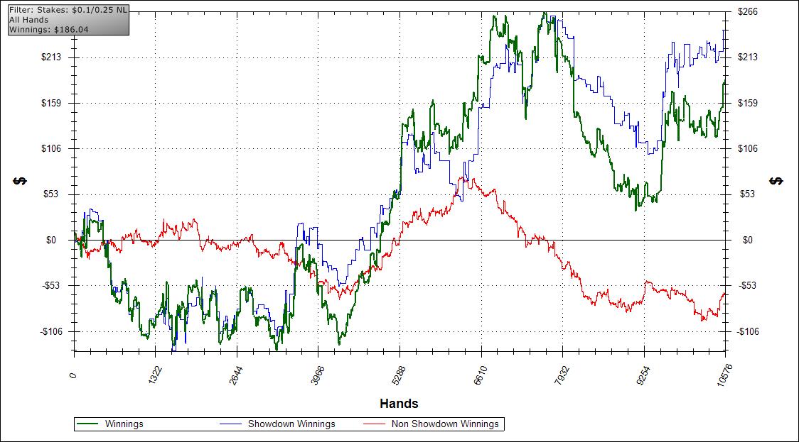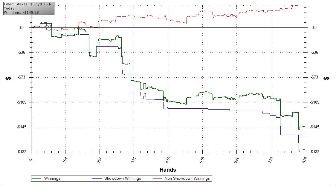 It's kind of hard to swallow because back in February I was NL50 reg and about to move up to NL100. But I had some rough downswings + tilt and moved back to Fixed Limit and wasted 5 months, and here we are at NL25. I've gotten better though so I guess it doesn't matter which stakes I'm playing, I know I'll get to my end of year goal which is to switch to part-time at my job once I make 50 buy-ins at NL100.