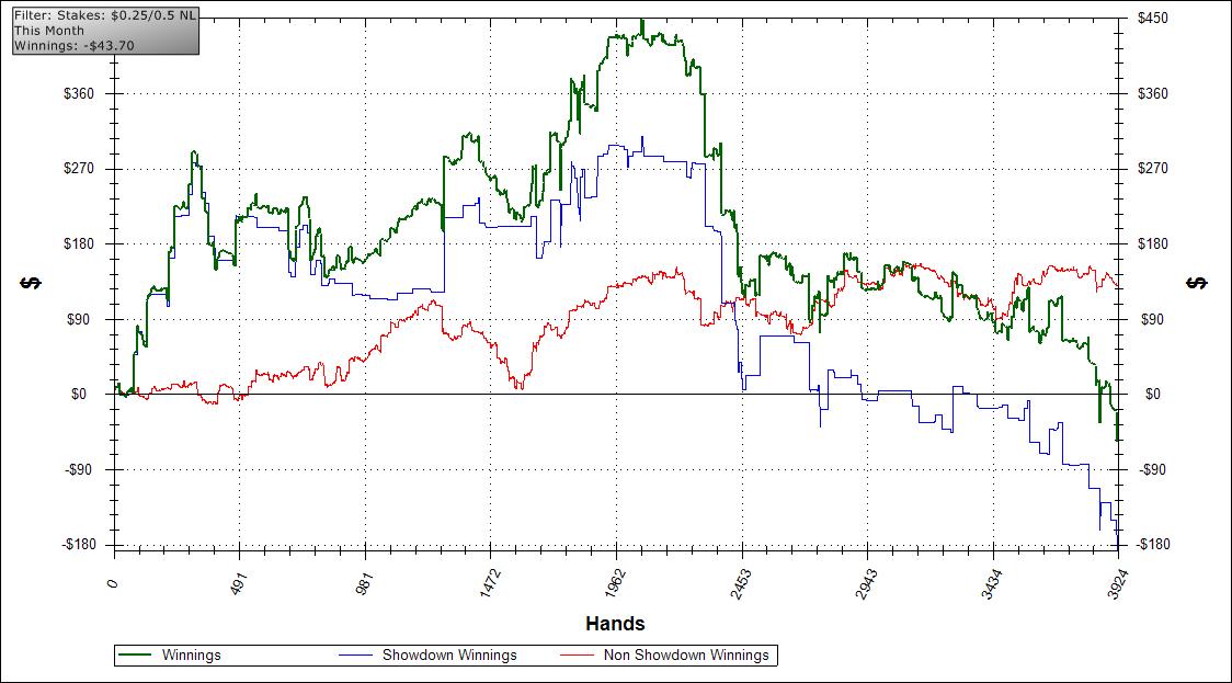 I started the month playing Fixed Limit still. Then I realized there's just not as much money in that game anymore and I can't deal with the variance involved. So after about 4 days into the month I switched to SnGs. Played those for about a week and then a friend of mine was visiting and he also plays poker. In short he basically was like "Lol why don't you play NL 6max cash.. it's the most profitable." Since then I've stuck to 6mad NL cash starting back at NL25.