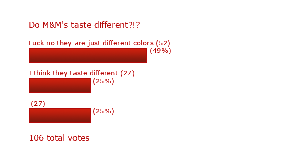 Ok so my room mate is sayin that whenever he gets a regular bag of M&M's just the reg kind no PB or peanuts or anything but is saying that they all taste different(like the colors have different flavors. I just wanna start a poll and see who thinks they taste different when all the color is is just food colorin and no different flavors so help me prove him wrong LP