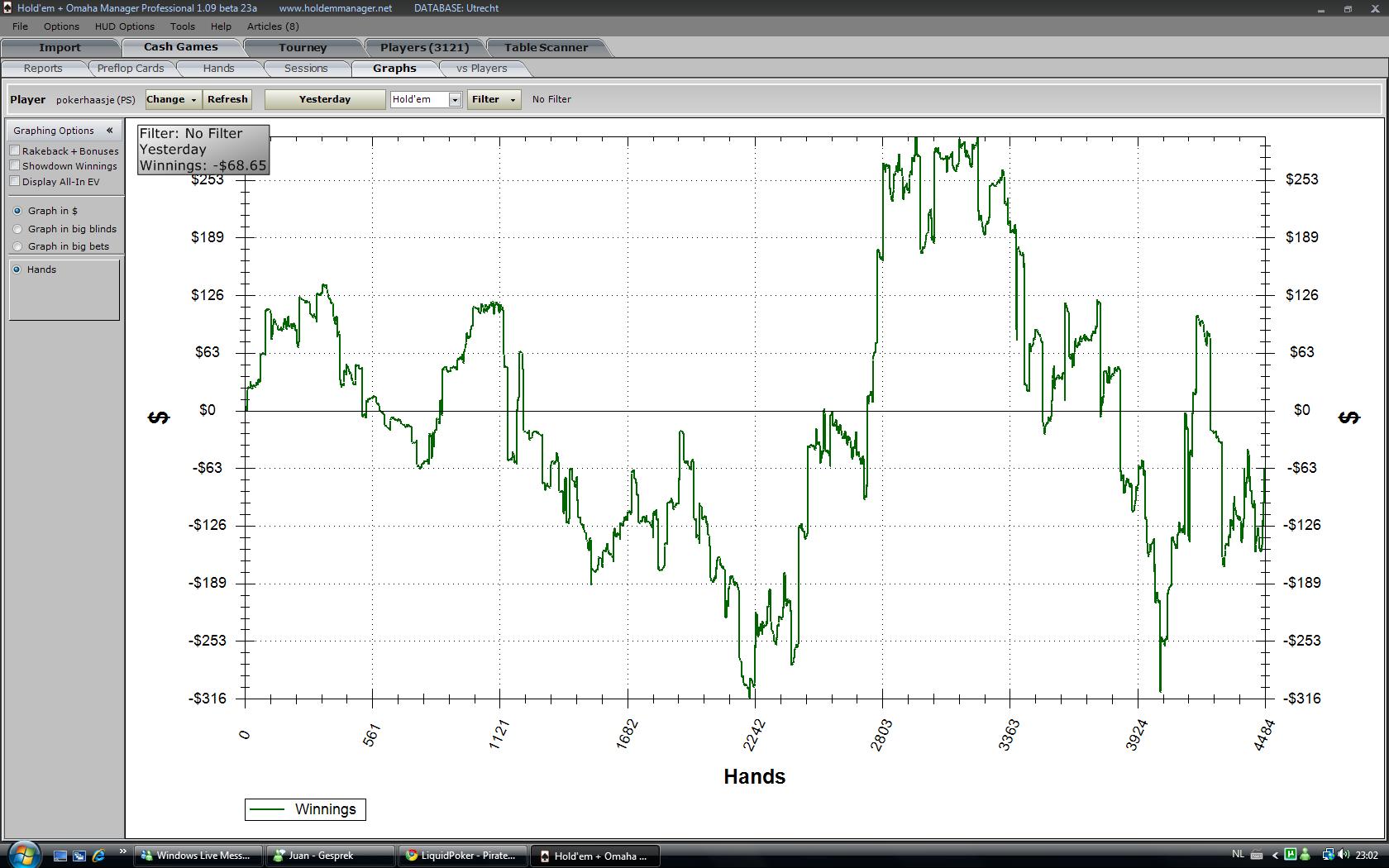 In the good bloggers tradition i'll update you from time to time with some results. Here are the results of whatever Holdemmanager calls "yesterday". it appears to me that it supposes i play from the USA or that axis of time. No problem, i'll just put yesterday's results up here as there is always another session to be played "today".
