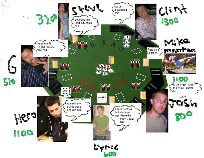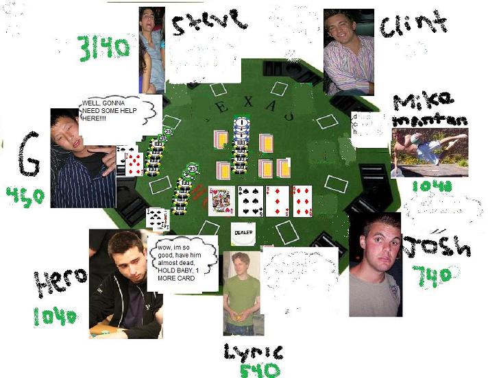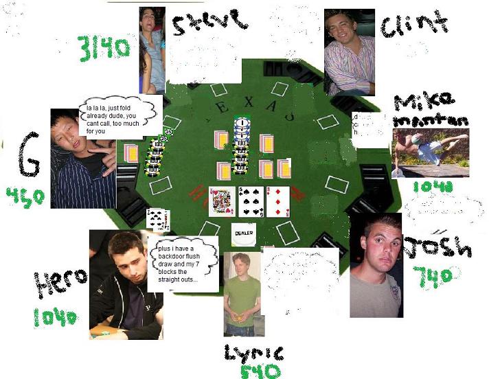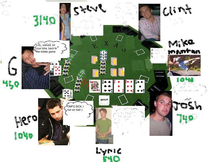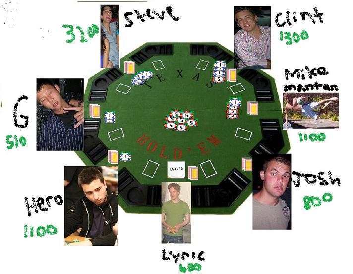 we all go a little crazy and decide for this hand we are going to play with a 5 dollar ante instead of 1 dollar. Here is how the hand went down in picture form. the green numbers beside our names is how much money we started the hand with.