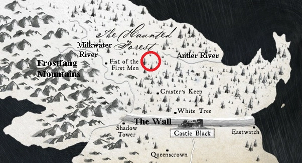 red circle is the position of the cave of 3 eyed raven. (Where the WWalkers are right now)