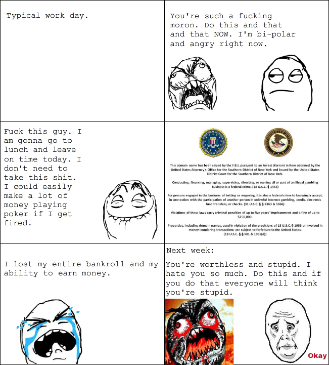 Why are you telling me Im spreading "unfounded fear". I am spreading fear based on what the biggest most powerful entity in the entire planet is saying they will do. You can choose to do whatever you want to do based on Tom Dwan or Pokerstars support is telling you. All Im saying is that I would think it is wiser to read the indictment and listen to the US Government story as well. Look at the facts. If Guy Laliberté put his entire net worth just to cover the fines it will not even be enough for half of it. And you listen to Tom Dwan?